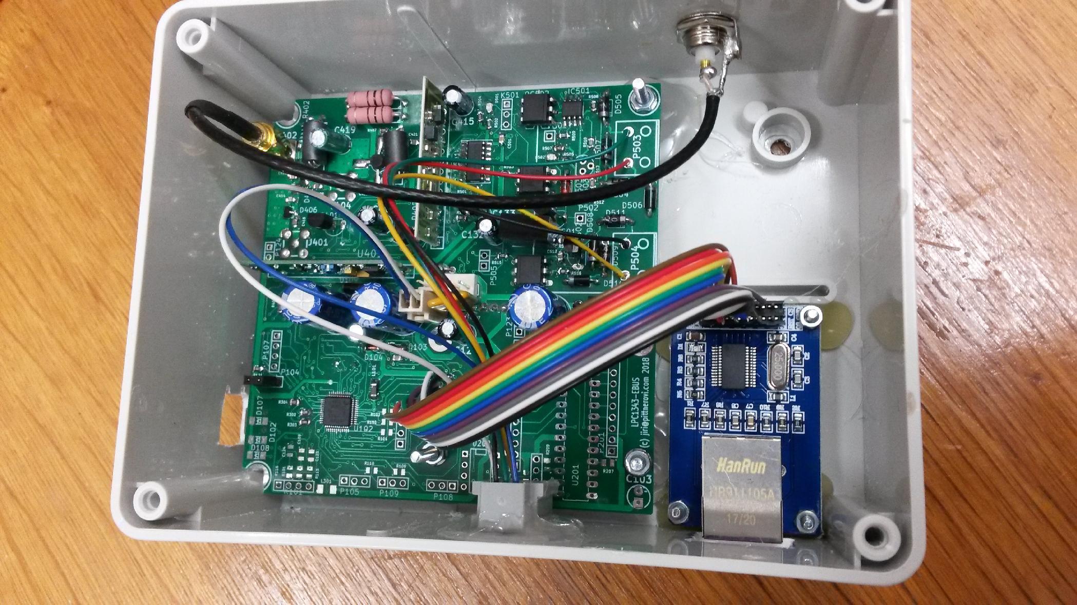 Basically I took my previous design with LPC1343 which had USB and LAN interfaces, added a 433MHz OOK communication module and an optoisolated EBUS interface based