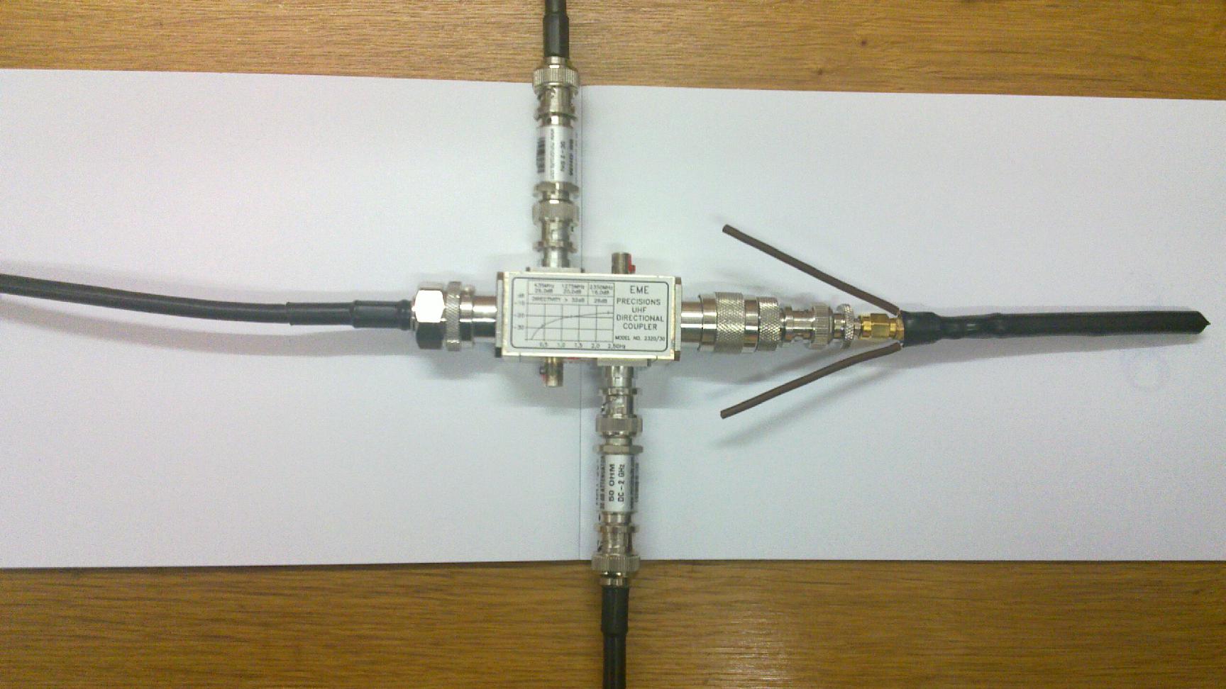 The input to the directional coupler is connected to the TX output of the WBX daughter-board of the USRP,