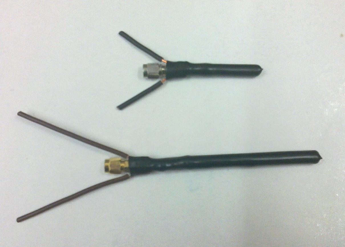 The antennas are constructed from a piece of RGC54 (H155) coaxial cable, crimped into a SMA connector.