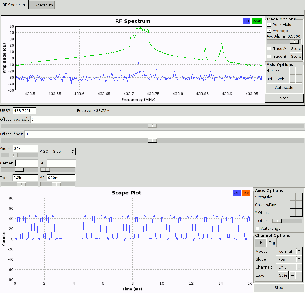 Due to the very simple circuitry, remotes of different manufacturers transmit at somewhat varying frequencies (cf. the two smaller peaks in the captured RF spectrum),